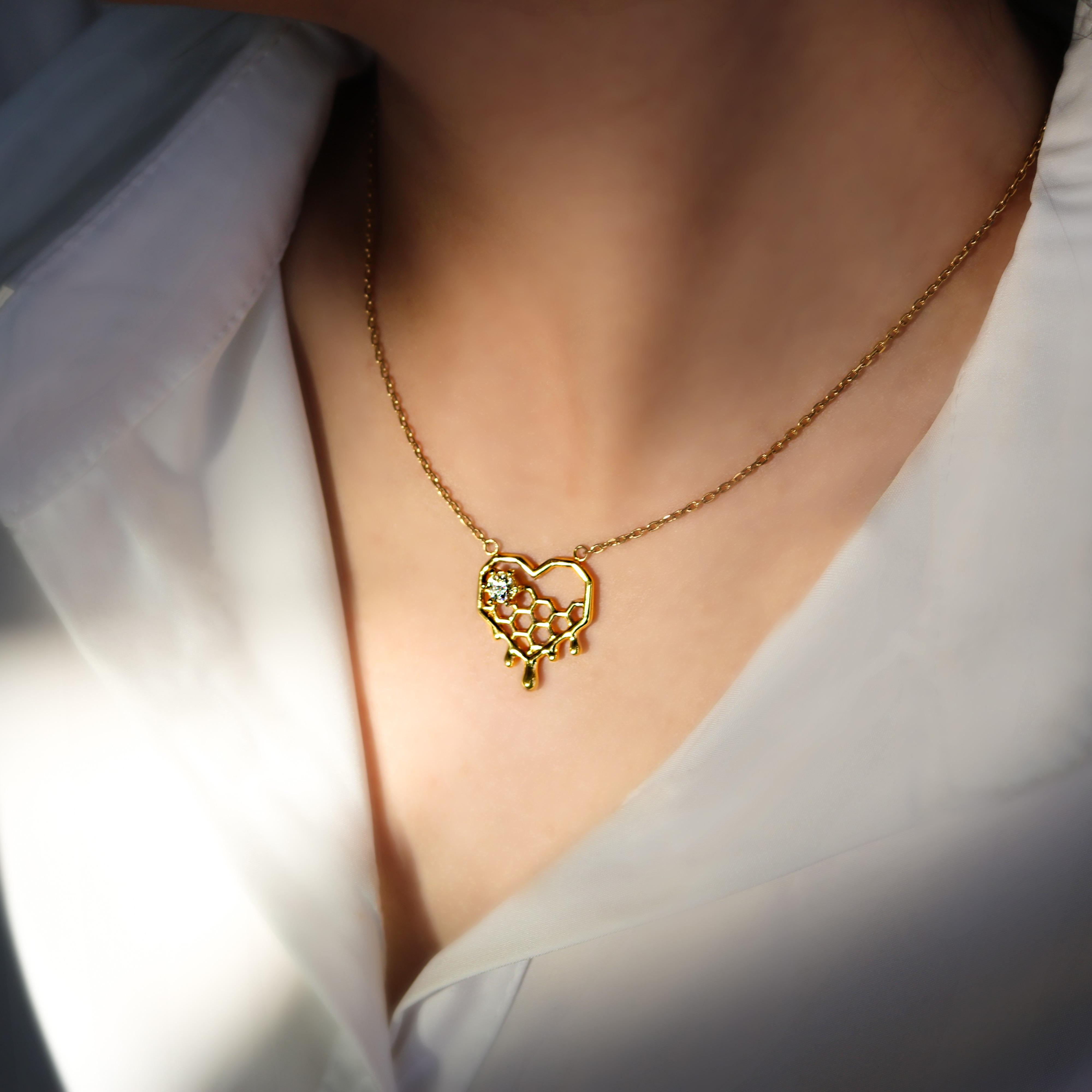 The Honey Drip Heart Necklace blends the natural beauty of honeycombs with the timeless elegance of a heart.
